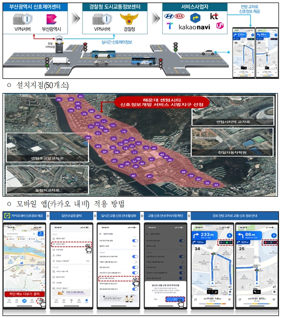 센텀지구 50개 교차로에서 ‘카카오내비’를 통해 서비스를 우선 개시하며, 앞으로 ‘티(T)맵’과 ‘현대 블루링크’ 등 다양한 모빌리티 플랫폼으로 확대 적용하는 방안을 검토 중이며, 서비스 대상 교차로도 넓혀갈 계획이다.