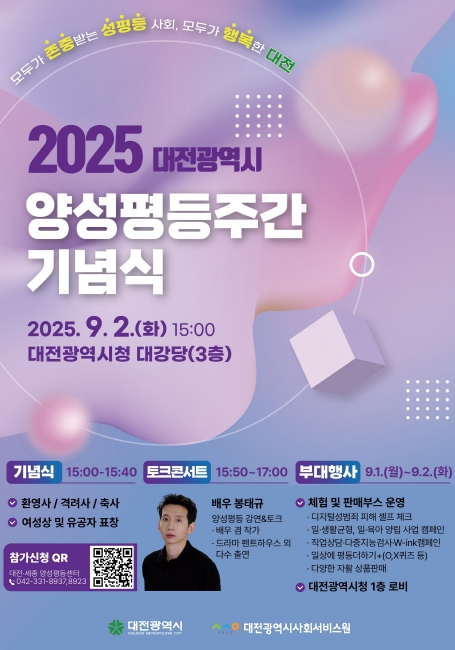 [뉴스서울] 대전시는 2025년 양성평등주간을 맞아 오는 9월 1일부터 7일까지 기념주간을 운영하며, 이에 앞서 9월 1일부터 4일까지 시청과 대전YWCA 일대에서 다양한 행사를 개최한다.