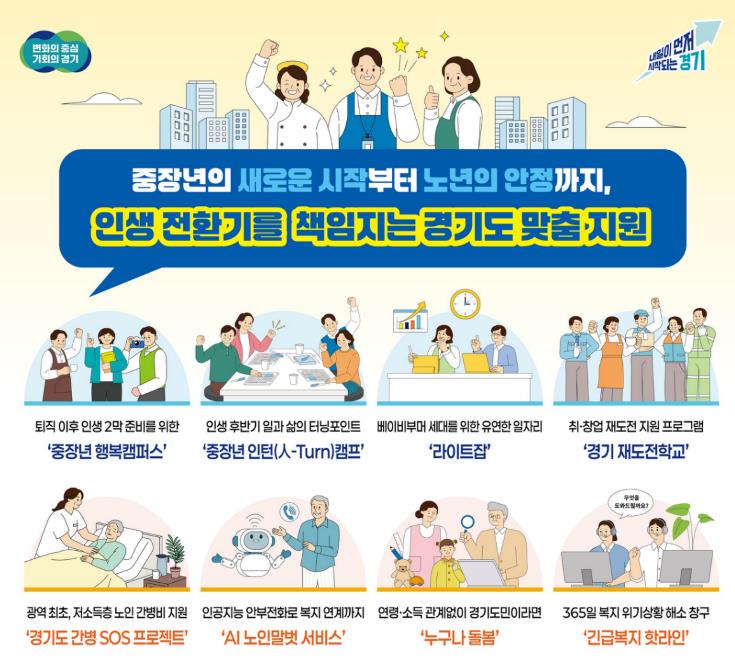 [뉴스서울] 퇴직 이후의 삶을 어떻게 꾸려야 할지 고민하는 중장년부터, 간병과 돌봄 문제로 어려움을 겪는 어르신과 가족까지. 경기도는 올해도 도민이 인생의 전환기에서 새로운 기회를 얻고 안정적으로 생활할 수 있도록 맞춤형 정책을 계속해 나간다.