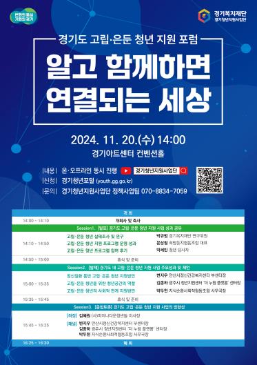 경기아트센터 컨벤션홀에서 열린 이번 포럼은 ‘알고 함께하면 연결되는 세상’이라는 주제 아래 경기청년지원사업단 유튜브 채널을 통해 온·오프라인 동시에 진행됐으며, 고립·은둔청년과 그 가족, 도 관계자 및 도의원 등 100명이 참석했다.