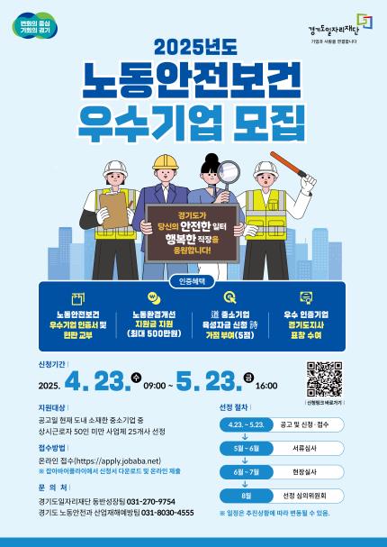 [뉴스서울] 경기도와 경기도일자리재단이 ‘2025년 경기도 노동 안전보건 우수기업 인증사업’에 참여할 중소기업을 4월 23일부터 5월 23일까지 한 달간 모집한다.