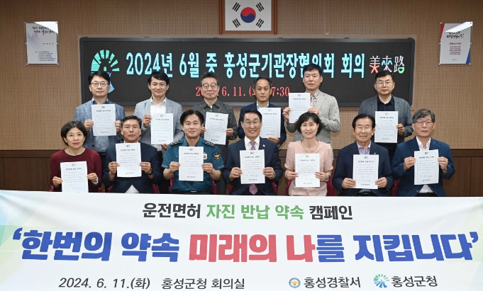 지난 11일 홍성군청 회의실에서 개최된 홍성군기관장협의회에서 이용록 홍성군수를 비롯한 15개 기관장들은 직접 ‘운전면허 반납 서약서’에 서명하며 고위험운전자 면허 반납 분위기를 조성하는 뜻깊은 시간을 가졌다.