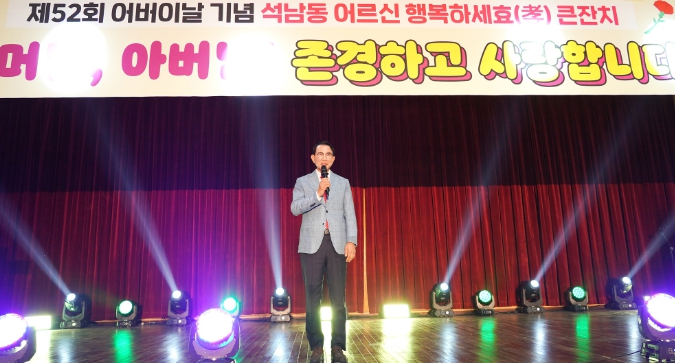 시에 따르면 4일 석남동 서산중학교 체육관에서 열린 ‘석남동 어르신 행복하세효(孝) 큰잔치’에는 이완섭 서산시장, 안원기 서산시의원, 문수기 서산시의원, 한승규·김영재 석남동새마을남녀지도자협의회장을 비롯한 새마을지도자 약 60명, 약 1천 명의 어르신들과 함께했다.