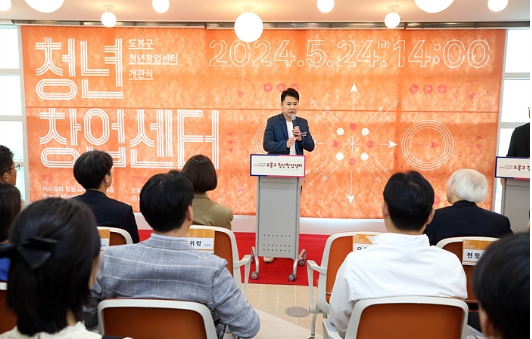 ▲ 오언석 도봉구청장이 지난 5월 24일 열린 도봉구 청년창업센터 개관식에서 축하 인사말을 하고 있다