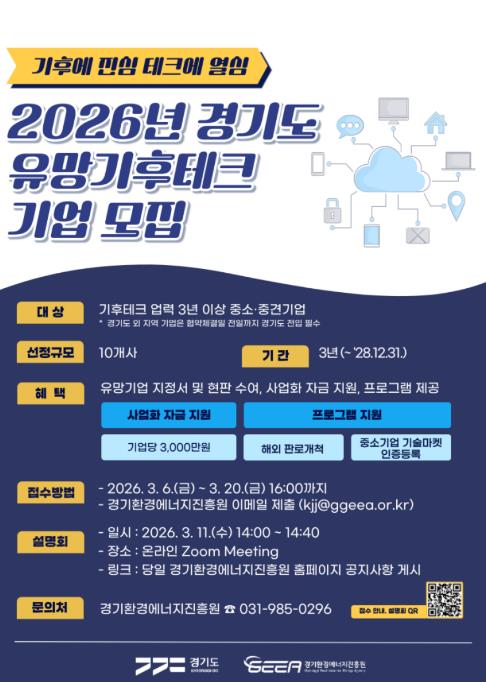 [뉴스서울] 경기도와 경기환경에너지진흥원이 기후위기 대응을 선도할 혁신 기술 보유 기업을 발굴하기 위해 오는 3월 20일까지 ‘2026년 경기도 유망 기후테크 기업’ 10곳을 모집한다.