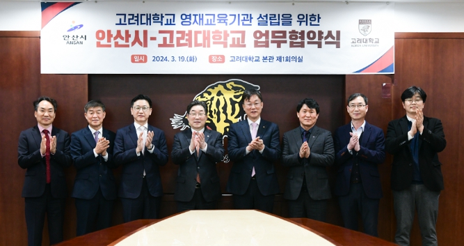 안산시는 지난 19일 오후 고려대학교 본관 제1회의실에서 이민근 안산시장과 김동원 고려대학교 총장, 권순영 안산병원장이 참석한 가운데 미래 인재 양성을 위한 영재교육기관 설립 업무협약(MOU)을 체결했다고 20일 밝혔다.