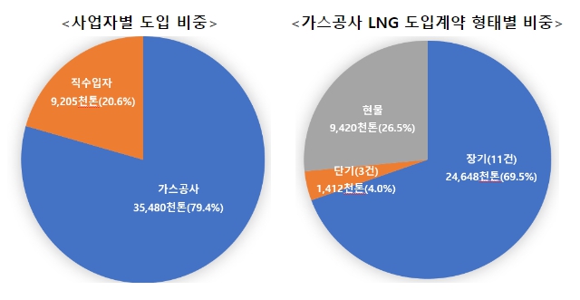 액화천연가스(LNG) 도입계약은 기간계약과 현물계약으로 구분한다. 기간계약은 도입기간(장·단기)과 가격조건을 구체적으로 정하여 체결하며 국제 에너지시장의 변동에도 가격과 수급이 상대적으로 안정적이다. 반면, 도입물량을 변경할 수 없어 도입 유연성은 낮다는 특징이 있다. 가스공사는 국내 천연가스 수요의 약 70~80% 수준을 기간계약으로, 나머지는 현물계약으로 조달하여 수요와 가격 변동성에 대응하고 있다.