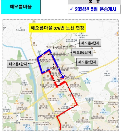 [뉴스서울] 파주시는 해오름마을 주민의 대중교통 편의를 개선하고자 5월 3일부터 마을버스 076번을 노선변경 및 증차한다고 밝혔다.