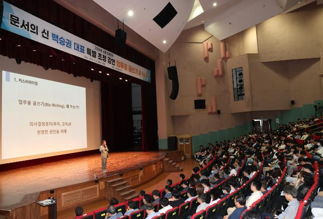 주요내용으로는 ▲한 장에 보고의 핵심을 담는 방법 ▲결론부터 던지는 두괄식 글쓰기 ▲논리를 구조화하는 개조식 표현 ▲직원들이 매일 작성하는 공문·기안서·품의서·보고서 구성 및 작성 원리로 직원들에게 큰 호응을 얻었다.