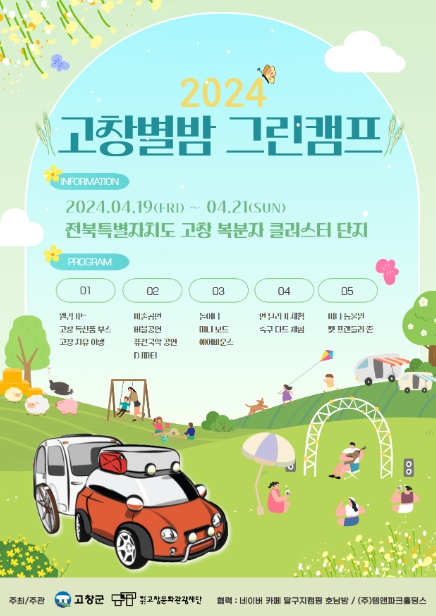 [뉴스서울] 고창문화관광재단이 오는 19일부터 21일 부안면 복분자클러스터 유원지에서 고창군과 함께 ‘2024 고창별밤 그린캠프’ 캠핑 축제를 개최한다.