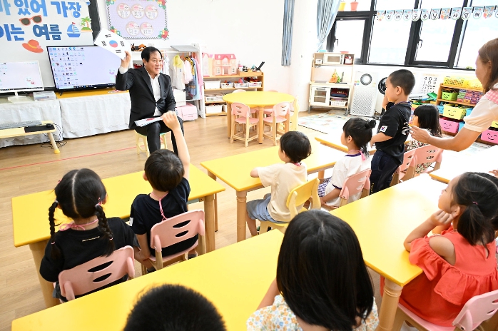 [뉴스서울] 심재국 평창군수는 지난 19일 민선 8기 하반기 중점과제로 어린이, 청소년, 청년, 여성을 위한 정책 강화를 통해'사람에 투자하는 `사람 중심의 행복 도시 평창`'을 구현하기 위한 첫 행보로 공립 대화어린이집을 방문하여 종사자들을 격려하고 아이들과 즐거운 시간을 보냈다.