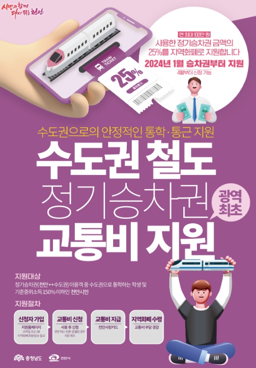 시는 일반·고속철도 정기승차권을 이용해 수도권으로 통학하는 학생과 기준중위소득 150% 이하인 천안시민을 대상으로, 사용한 승차권 금액의 25%를 천안사랑카드로 환급하고 있다.