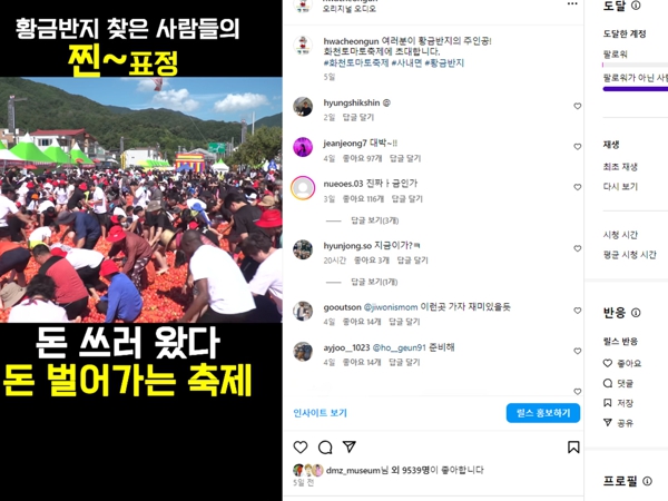 화천군청 기획감사실 홍보부서가 자체 제작한 ‘황금반지 찾은 사람들의 찐~표정’이라는 제목의 축제 홍보영상은 지난 20일 인스타그램에 업로드된 이후 5일이 지난 24일 현재, 조회수 210만뷰를 넘어섰다.