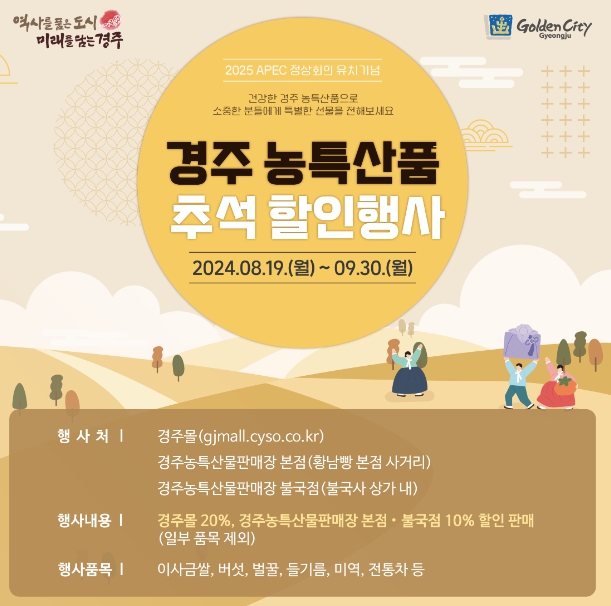 농특산물은 오는 30일까지 온라인 경주몰에서 20%, 오프라인 경주농특산물판매장 본점(계림로 69)과 불국점(진현로1길 59-5)에서 각각 10% 할인 혜택을 제공한다.