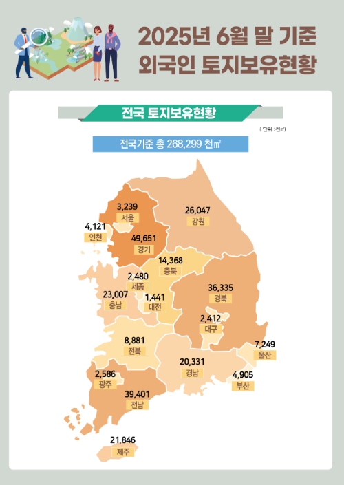 외국인이 보유한 국내 토지면적은 268,299천㎡로, 전체 국토면적(100,459,874천㎡)의 0.27% 수준이다.