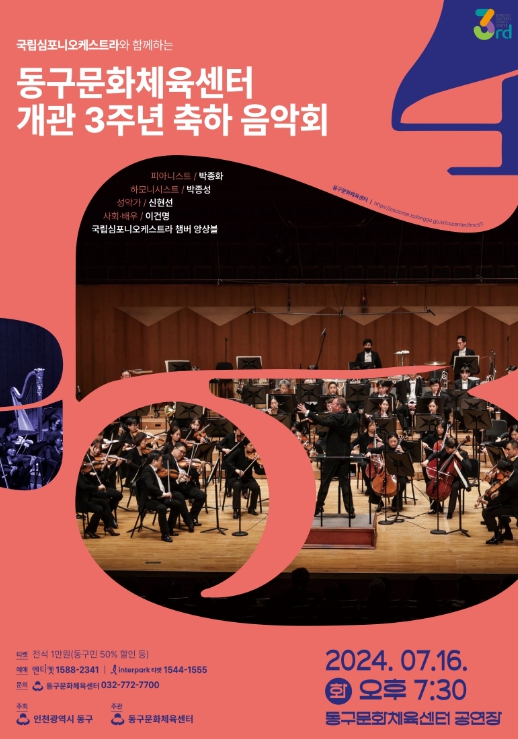 [뉴스서울] 인천 동구문화체육센터는 개관 3주년을 맞아 오는 16일 오후 7시30분 '동구문화체육센터 개관 3주년 축하음악회'를 개최한다고 밝혔다.