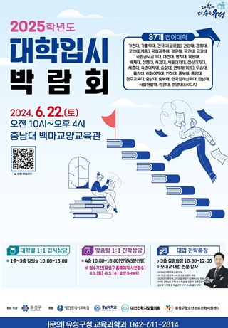 [뉴스서울] 유성구는 오는 6월 22일 오전 10시부터 오후 4시까지 충남대학교 백마교양교육관에서 『2025학년도 대학입시박람회』를 개최한다.