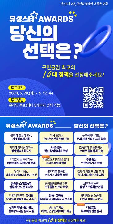 [뉴스서울] 유성구가 민선8기 선보인 다양한 정책 중 유성을 빛낸 '구민공감 10대 정책'을 선정하기 위해 28일부터 6월 12일까지 온라인 투표를 진행한다.