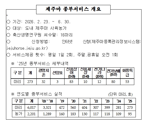 서비스는 평일에는 오전·오후 각 1회, 주말 및 공휴일에도 오전 1회 제공된다. 농가 편의를 위해 전담직원을 배치하고 제주마의 발정 시기에 맞춰 운영한다.