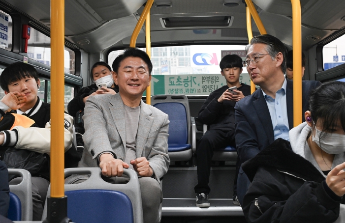 이날 김동근 시장은 의정부지방법원.검찰청 앞 정류소에서 버스를 기다리는 학생들과 대화를 나눈 뒤 버스에 탑승했다. 이어 의정부고등학교, 의정부여자고등학교, 의정부공업고등학교로 이동하며 학생들의 의견을 듣고 통학 불편이 없는지 세밀하게 살폈다.