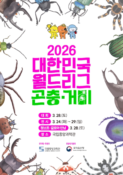 [뉴스서울] 과학기술정보통신부 국립중앙과학관은 3월 24일부터 29일까지'2026 대한민국 세계 연맹전(월드 리그) 곤충·거미' 행사를 개최한다. 이번 행사는 곤충과 거미의 생태적 가치와 매력을 직접 체험할 수 있도록 마련된 참여형 행사로 전시와 경진대회, 체험 교육, 박람회 전시관(부스) 등이 함께 운영된다.