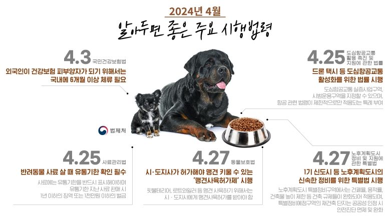 [뉴스서울] 4월부터는 맹견을 키우려면 시ㆍ도지사의 허가를 받아야하며, 도심항공교통 활용을 지원하기 위한 법률이 시행된다. 법제처는 이러한 내용을 포함하여 4월에 총 85개의 법령이 새로 시행된다고 밝혔다. 시행 예정 법령의 주요 내용과 시행일은 다음과 같다.