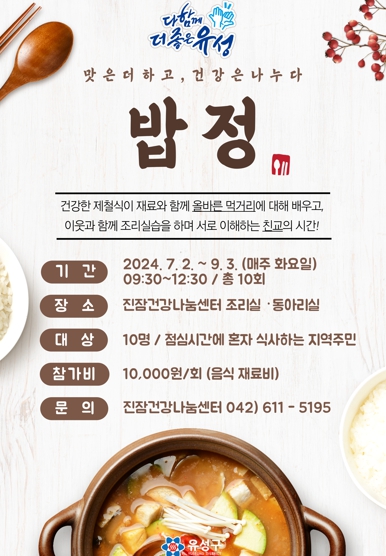 [뉴스서울] 대전 유성구는 9월 3일까지 총 10주간 진잠건강나눔센터에서 지역주민을 대상으로 건강음식 프로그램 ‘밥정(情)’을 운영한다.