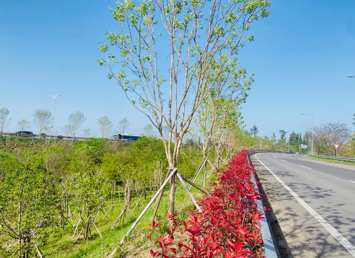 공항서로의 생육이 불량한 띠녹지에는 홍가시나무, 황금사철 등의 수목을 보완 식재해 붉은색, 노란색, 초록색 물결을 이루는 밝고 생기 있는 분위기의 도시 공간을 연출했다.