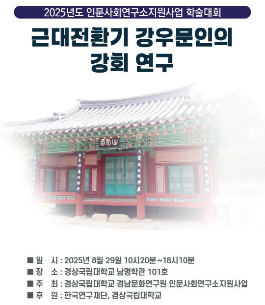 [뉴스서울] 경상국립대학교 경남문화연구원 인문사회연구소지원사업에서는 8월 29일 오전 10시 20분 남명학관 101호에서 ‘근대전환기 강우 문인의 강회(講會) 연구’라는 주제로 학술대회를 개최한다.