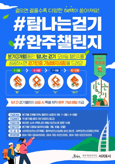 『탐나는 걷기』 완주 챌린지는 모바일 걷기챌린지에 참여한 시민중에 장기간 걷기 성공자를 대상으로 계절(3개월)마다 특별 제작한 걷기인증 기념배지를 지급하고, 1년 성공 시 완주기념 메달 지급하는 이벤트 사업이다.