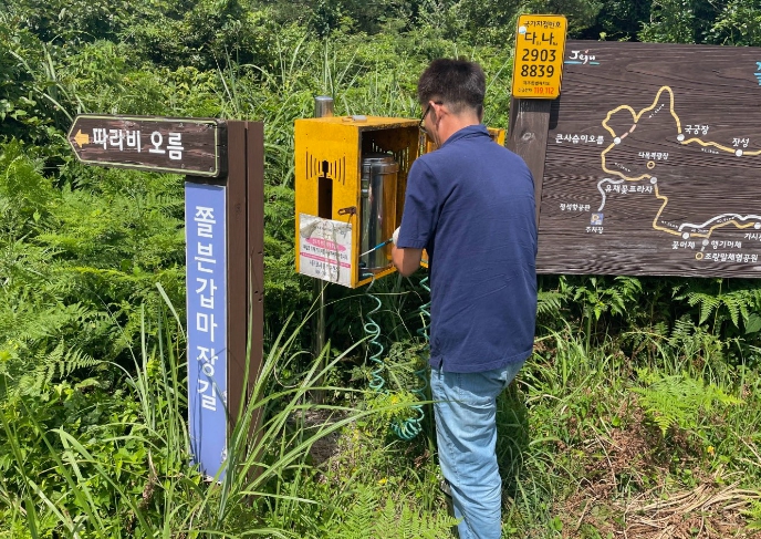 동부보건소에서는 지역주민 및 관광객이 자주 찾는 산책로 등 14개소에 설치된 수동분사기에 대해 정상 작동 여부 및 약품 보충, 소모품 교체 등 점검한다.