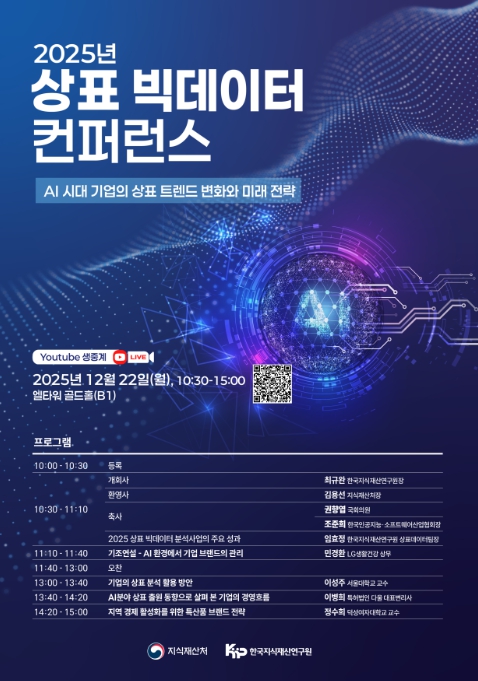 [뉴스서울] 지식재산처가 주최하고 한국지식재산연구원이 주관하는 ‘2025년 상표 빅데이터 학술회의’가 12월 22일 10시 30분 엘타워 골드홀(서울 서초구)에서 개최된다.