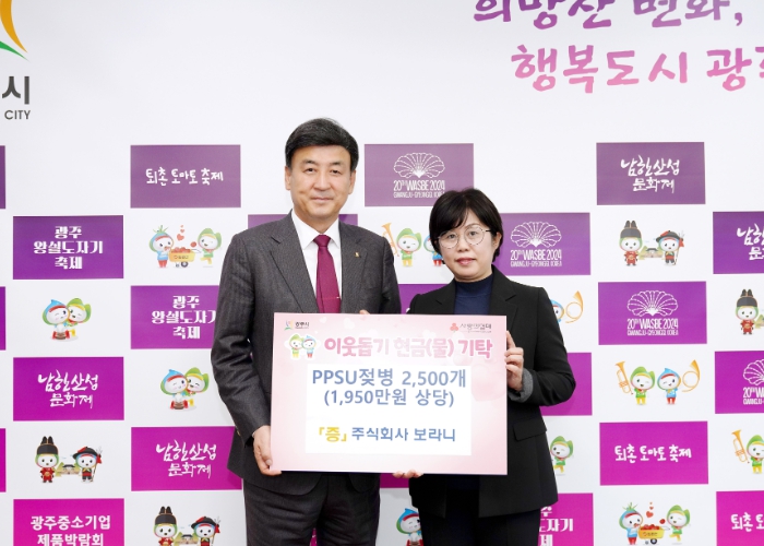[뉴스서울] ㈜보라니 허명순 대표는 지난 12일 광주시청을 방문, 도움의 손길이 필요한 이웃을 위해 사용해 달라며 이웃돕기 현물로 PPSU 젖병 2천500개(1천950만원 상당)를 전달했다.