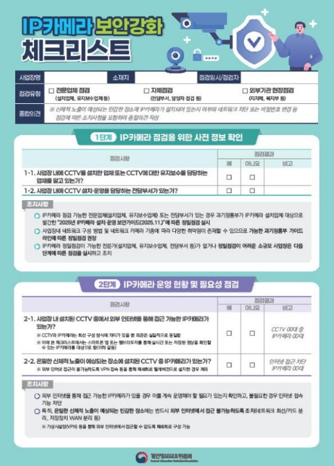 이에 개인정보위는 소규모 사업장 등에서 이행할 수 있는 ‘IP카메라 점검 체크리스트’를 마련한다. 또한, 관계부처(문화체육관광부, 보건복지부 등), 지방자치단체, 주요 직능단체 등과 협력하여 공공시설물, 의료기관, 소규모 사업장(헬스장, 노래방 등) 등에 대한 IP카메라 자율점검 및 보안조치 이행을 적극 추진한다.