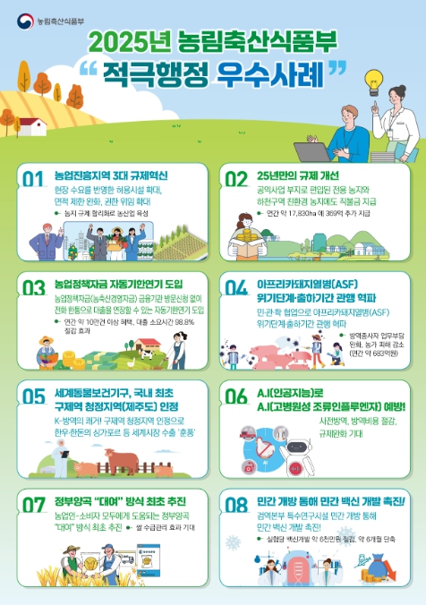 김정주 농식품부 정책기획관은 “농업·농촌 현장의 목소리를 반영해 불합리한 규제를 지속 개선하고, 국민이 체감할 수 있는 적극행정 성과 창출을 위해 최선을 다하겠다”라고 밝혔다.