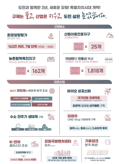 김진태 도정은 특별자치시대 개막과 함께 ‘규제는 풀고, 산업은 키우고, 도민의 삶을 높이는’데 중점적으로 도정을 운영해 왔다.