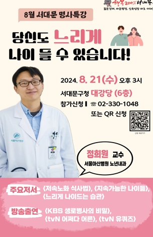 [뉴스서울] 서대문구가 이달 21일 오후 3시 구청 6층 대강당에서 서울아산병원 노년내과 정희원 교수를 초청해 ‘당신도 느리게 나이들 수 있습니다’란 주제로 8월 서대문 명사특강을 개최한다.