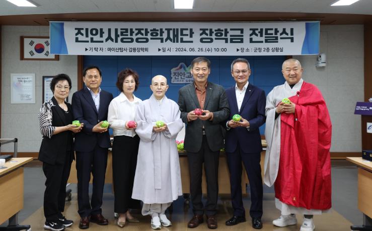 [뉴스서울] 마이산탑사 갑룡장학회는 26일 진안군청 상황실에서 진안사랑장학재단에 장학금 1,000만원을 기탁했다.