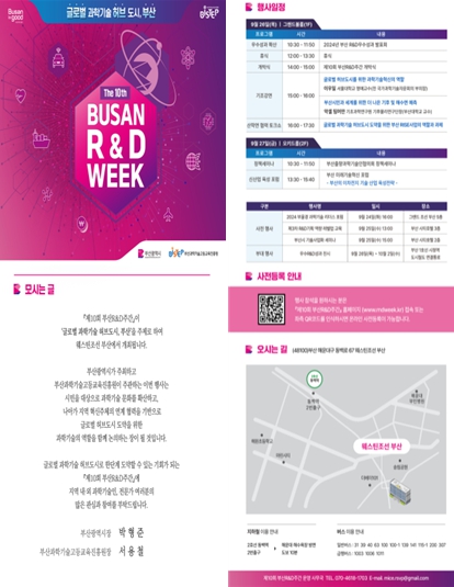 올해는 '글로벌 과학기술 허브도시, 부산'을 주제로, ▲기조강연 ▲산·학·연 협력 토크쇼 ▲정책 토론회(포럼) ▲부산 연구개발(R·D) 우수성과 발표회 등이 진행될 예정이다.