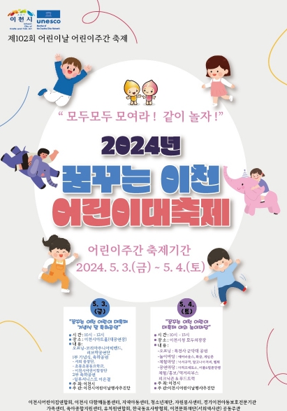 [뉴스서울] 이천시는 제102회 어린이날을 맞이하여 이천시가 주최하는 제2회 “2024년 꿈꾸는 이천 어린이 대축제!”어린이날 행사를 5월 3일 ~ 4일 개최한다고 밝혔다. 5월 3일은 10시부터 12시까지 이천아트홀에서 기념식과 축하공연이 진행되고, 4일은 10시부터 15시까지 시청사 모두의 광장에서 가족들이 함께 즐길 수 있는 다양한 놀이마당(에어바운스)과 게임존, 공연, 체험부스, 푸드트럭 등 다채로운 놀거리를 마련했다.