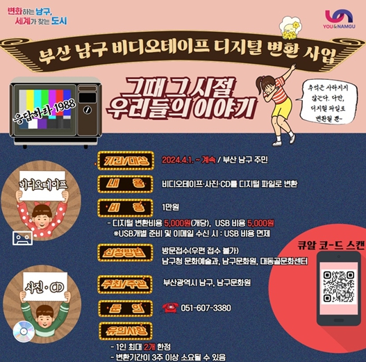 부산 남구는 주민의 추억이 담긴 비디오테이프(사진, CD도 가능)를 디지털 영상으로 변환하여 추억을 재생·보존하는 비디오테이프 디지털 변환 사업을 남구문화원과 함께 진행한다.