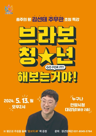 특강은 오는 13일 오후 2시 안양시청 별관 2층 대강당에서 ‘브라보 청년 해보는거야!’라는 주제로 진행된다.