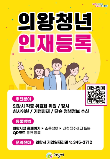 의왕청년 인재등록은 다양한 분야의 청년들이 자발적으로 등록한 인재 데이터를 바탕으로 각종 위원회 추천, 자문 및 심사요청, 강사 추천, 정책 정보 전달 등의 시정 참여 기회 확대와 청년인재 발굴을 위한 상시 인재등록 시스템이다.