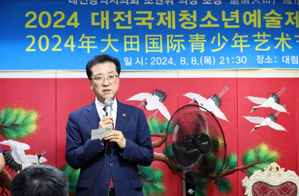 [뉴스서울] 대전시의회 조원휘 의장은 지난 8일 저녁 열린‘2024 대전 국제청소년예술제 환영 리셉션’에 참석해 중국 예술가협회 허지아 부회장을 비롯한 관계자들을 환영하고, 뜻깊은 자리를 마련한 (사)한국예총 대전광역시연합회 성낙원 회장에게 감사를 전했다.