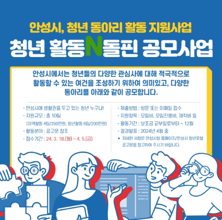 [뉴스서울] 안성시는 '제1회 안성시 청년 활동Network돌핀 공모사업'을 통해 청년들의 동아리 활동을 지원한다고 밝혔다. 이 프로그램은 지역활동과 청년 활동 분야로 나누어 각각 4팀과 6팀을 선발하여 지원할 예정이다.