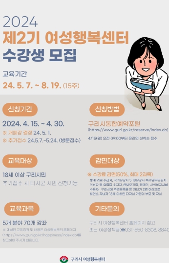 [뉴스서울] 구리시는 오는 4월 15일부터 4월 30일까지 구리시 통합예약포털을 통해 ‘2024년 2기 여성행복센터 교육프로그램’ 수강생을 선착순 모집한다.