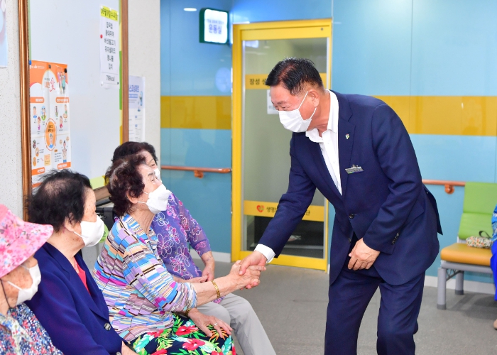 ▲ 장성군이 효도권 확대 등 5개 사업을 상반기 적극행정 우수사례로 선정했다. 지역 어르신들에게 악수를 건네고 있는 김한종 군수 |