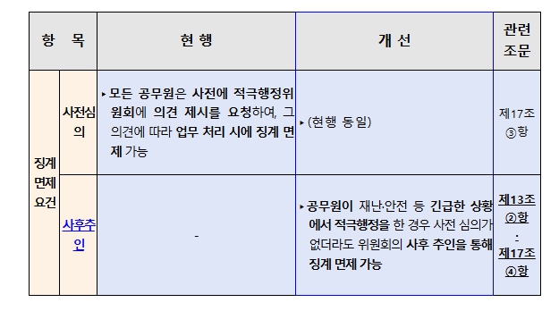 기존에는 기관별 설치된 적극행정위원회의 사전 심의를 거쳐 업무를 처리한 경우에만 징계 면제가 가능했으나 긴급한 재난 상황 등에서는 사전심의를 받기가 사실상 어려운 현실을 반영해 사후에도 징계 면제가 가능토록 개선했다.