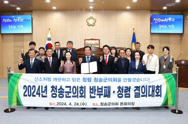 [뉴스서울] 청송군의회는 제271회 임시회 첫날인 24일 본회의장에서 의원 및 직원 전원 23명이 참석한 가운데, '2024년 청송군의회 반부패·청렴 실천 결의대회'를 개최했다.
