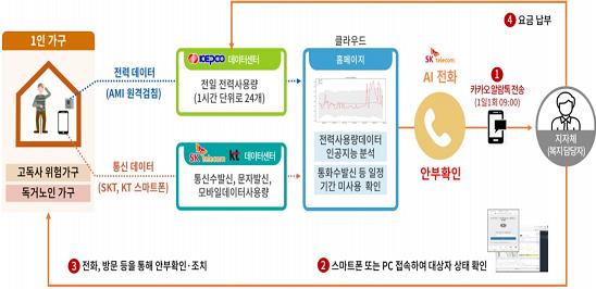 이 서비스는 매일 전력 사용량과 통신데이터(통화․문자 수발신, 모바일 데이터 사용여부)를 활용하여 1인 가구의 사용 패턴을 인공지능(AI)으로 분석하여 평상시와 다른 이상징후가 감지되면 정보를 관할 읍면 복지 담당자에게 알림으로 전송한다.